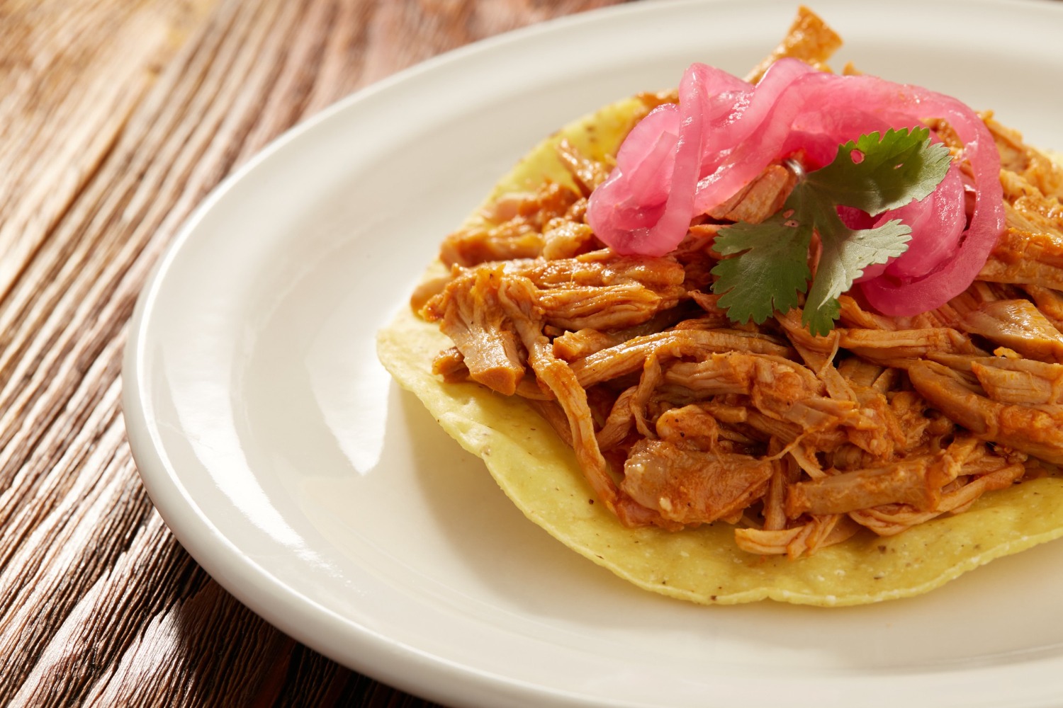 Sirva com cebola roxa em conserva e tortilhas de milho.